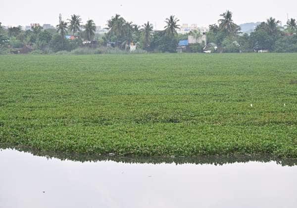 பருவமழை துவங்கி உள்ள நிலையில், முறையாக தூர்வாரப்படாமல் ஆகாயத்தாமரை செடிகள் அதிக அளவில் படர்ந்திருக்கும் பல்லாவரம் ஏரி.