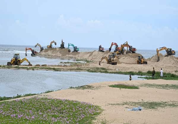 அடையாறு ஆற்றின் முகத்துவாரம் பகுதியில் நீர்வளத்துறை சார்பில் நடந்துவரும் தூர்வாரும் பணிகளை துரிதப்படுத்த அதிக அளவில் பணியில் ஈடுபட்டுள்ள பொக்லைன் இயந்திரங்கள். இடம்: சீனிவாசபுரம்.