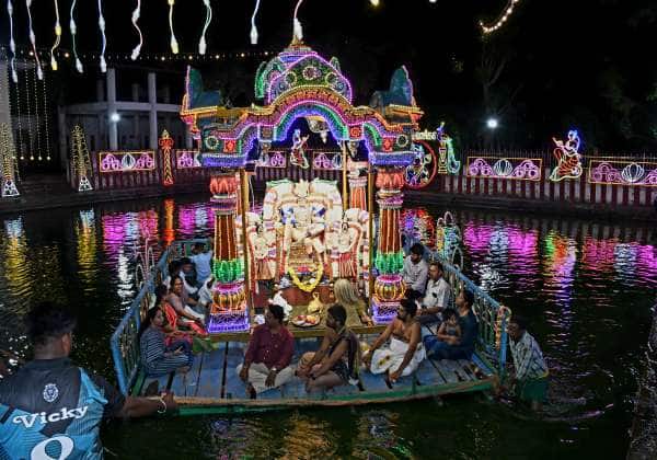 புதுச்சேரி கௌசிக பாலசுப்பிரமணியர் கோயிலில் கந்த சஷ்டி விழாவை முன்னிட்டு காந்தி வீதி வேதபுரீஸ்வரர் கோயிலில் சுவாமி தெப்பல் உற்சவம் நடந்தது.