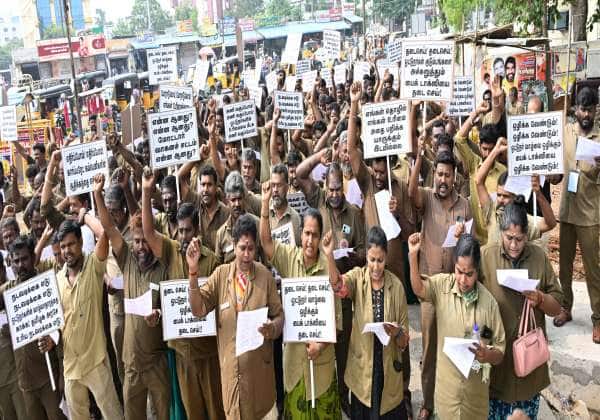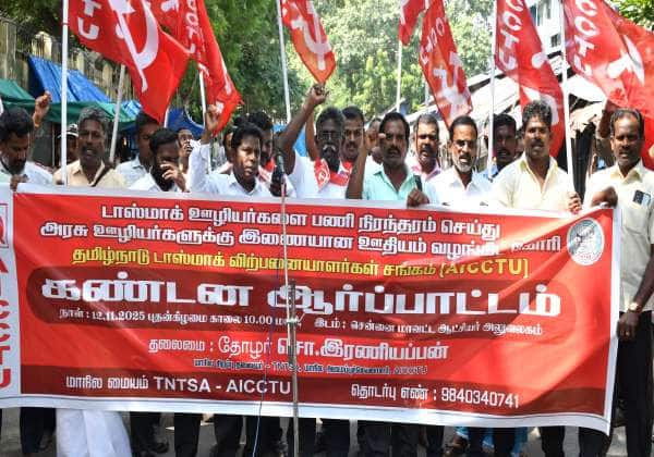 டாஸ்மாக் ஊழியர்களின் பணியை நிரந்தரம் செய்யக்கோரி, தமிழ்நாடு டாஸ்மாக் விற்பனையாளர்கள் சங்கத்தினர், சென்னை கலெக்டர் அலுவலகம் அருகே கண்டன ஆர்ப்பாட்டம் நடத்தினர்.இடம்: ஜார்ஜ் டவுன்.