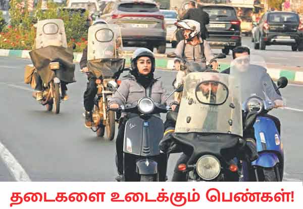 மேற்காசிய நாடான ஈரானில் பெண்களுக்கு பல கட்டுபாடுகள் உள்ளன. ஹிஜாப் எனப்படும் முகத்தை மறைக்கும் துணியை அணிய வேண்டும் என்ற கட்டுப்பாட்டுக்கு எதிராக 2022ல் பெரிய அளவில் போராட்டங்கள் நடந்தன. தற்போது சமூக, கலாசார சட்ட கட்டுப்பாடுகளை உடைத்து, ஆங்காங்கே பெண்கள், பைக் ஓட்டத் துவங்கி உள்ளனர். இடம்: டெஹ்ரான்.