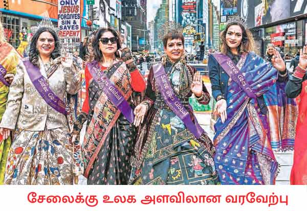 அமெரிக்காவின் நியூயார்க் நகரில் உள்ள புகழ்பெற்ற டைம்ஸ் சதுக்கத்தில், இந்தியாவின் பாரம்பரிய உடையான சே லைக்கு கிடைத்து வரும் உலகளாவிய வரவேற்பை கொண்டாடும் வகையில் நடத்தப்பட்ட நிகழ்ச்சியில், சேலை அணிந்து பங்கேற்ற பல்வேறு நாடுகளைச் சேர்ந்த பெண்கள்.