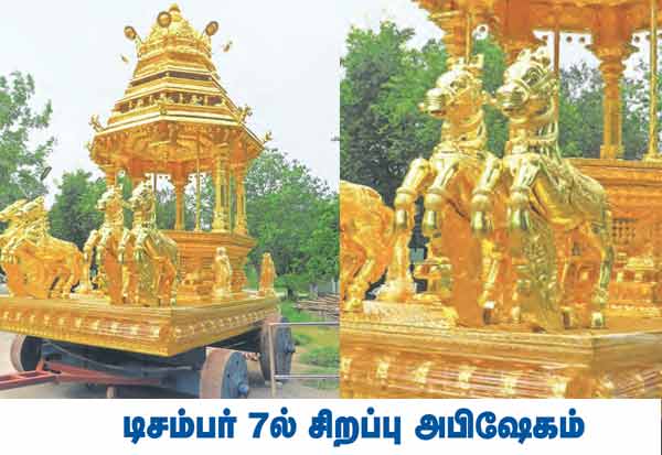 காஞ்சிபுரம் ஏகாம்பரநாதர் கோவிலுக்கு புதிதாக செய்யப்பட்டு உள்ள தங்கத்தேருக்கு டிசம்பர் 6ம் தேதி வெள்ளோட்டமும், டிசம்பர் 7ம் தேதி சிறப்பு அபிஷேகமும் நடைபெற உள்ளது.