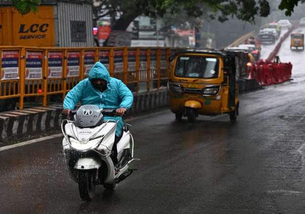 சென்னையில் சிறிது நேரம் கொட்டித் தீர்த்த மழையில் நனைந்தபடி செல்லும் வாகன ஓட்டிகள் மற்றும் பொதுமக்கள்.இடம் : ஆழ்வார்பேட்டை