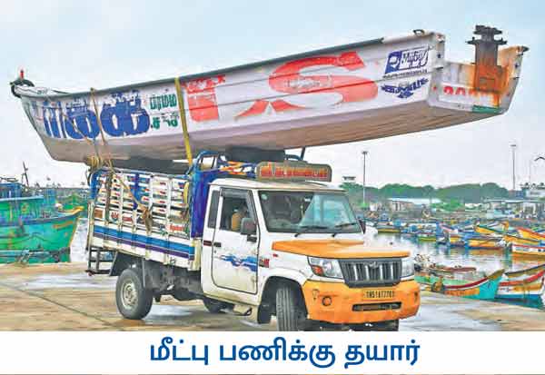 சென்னையில் வடகிழக்கு பருவமழையின் தாக்கம் அதிகரித்து வரும் நிலையில், வெள்ளத்தால் பாதிக்கப்படும் பகுதிகளில் மீட்பு பணிகளை மேற்கொள்ள வசதியாக, காசிமேடு மீன்பிடி துறைமுகத்தில் இருந்து வாகனம் மூலம் எடுத்துச் செல்லப்படும் சைபர் படகு.