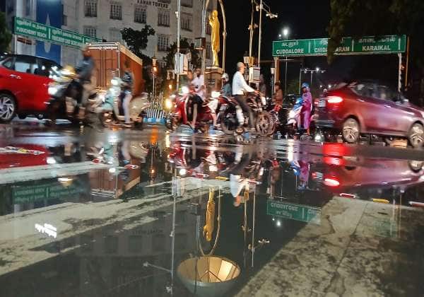 புதுச்சேரியில் காலையிலிருந்து இரவு முழுமையும் லேசான தொடர் மழை பெய்தது. தேங்கியுள்ள மழை நீரில் பிரதிபலிக்கும் ராஜீவ் காந்தி சிக்னல்.