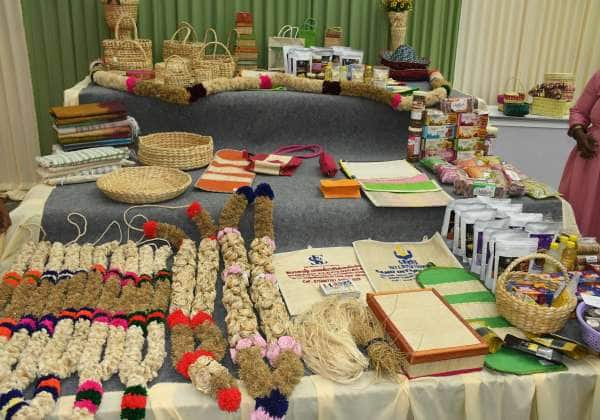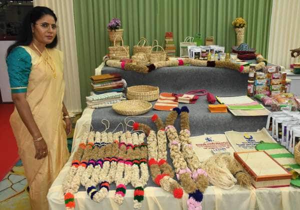 கோவை கொடிசியா வளாகத்தில் நடந்த இயற்கை வேளாண்மை கண்காட்சியில் வாழை நாரில் தயாரிக்கப்பட்ட மாலைகள்.