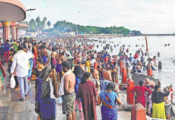 ராமேஸ்வரம் ராமநாதசுவாமி கோவில் அக்னி தீர்த்த கடலில் ஏராளமான பக்தர்கள் புனித நீராடினார்கள்.