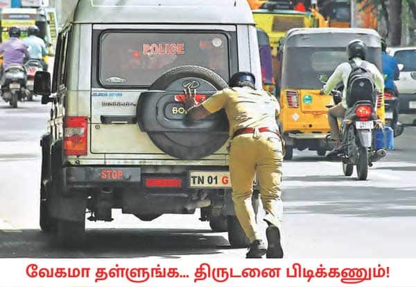 அவ்வப்போது சாலையில் திடீரென பிரேக் டவுன் ஆகி நிற்கும் அரசு வாகனங்களில் ஒன்றான இந்த போலீஸ் வாகனத்தை, தனி ஒருவராக தள்ளிய போலீஸ்காரர். இடம: ராயபுரம், சென்னை.