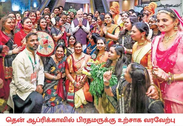 ஜி 20 அமைப்பின் உச்சி மாநாட்டில் பங்கேற்க தென் ஆப்ரிக்கா சென்றுள்ள பிரதமர் நரேந்திர மோடிக்கு, உற்சாக வரவேற்பு அளித்த இந்திய வம்சாவளியினர். இடம்: ஜோகன்ஸ்பர்க்.
