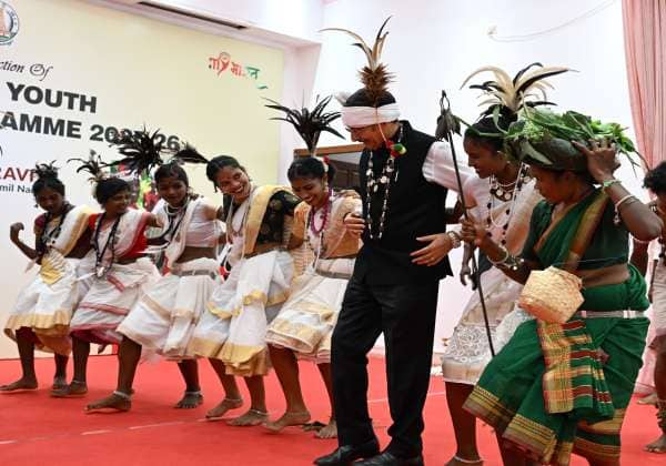 சென்னை கவர்னர் மாளிகையில் நடந்த 17வது பழங்குடியினர் இளைஞர் பரிமாற்ற நிகழ்ச்சியை துவக்கி வைத்து, சத்தீஸ்கர் மாநில பழங்குடியின மாணவர்களுடன் பாரம்பரிய இசைக்கு நடனம் ஆடிய தமிழக கவர்னர் ரவி.இடம் : கிண்டி
