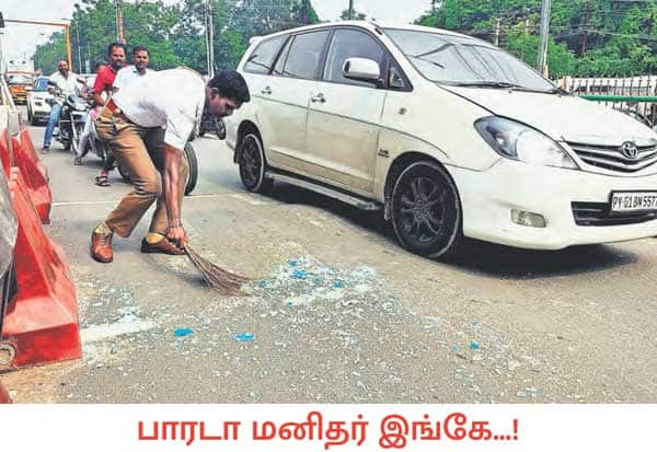தஞ்சாவூர் பெரியகோவில் எதிரே ஏற்பட்ட விபத்தில், உடைந்த கார் கண்ணாடிகள் சாலையில் சிதறி கிடந்தன. இதனால் பிறருக்கு இடையூறு ஏற்படக்கூடாது என எண்ணி, அங்கு பணியில் இருந்த போக்குவரத்து போலீஸ் எஸ்.ஐ., ராஜகண்ணன், யாரையும் எதிர்பார்க்காமல் தானே துடைப்பம் போட்டு சுத்தம் செய்தார். இந்த செயலை பலரும் பாராட்டி சென்றனர்.