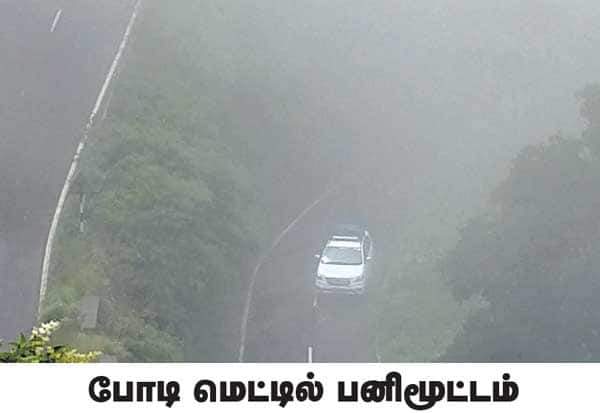 இயற்கை எழில் கொஞ்சும் போடி- மூணாறு செல்லும் போடிமெட்டு மலைப்பாதையில் ரோட்டை தழுவிச் செல்லும் பனி மூட்டம்.