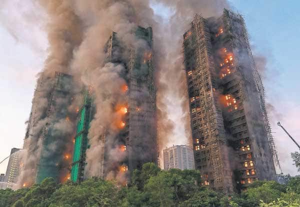 ஹாங்காங் நியூ டெரிட்டரிஸ் பகுதியில் உள்ள குடியிருப்பு வளாகத்தில் ஏற்பட்ட தீ விபத்தில் பற்றி எரியும் கட்டடங்கள்.