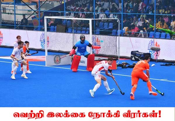மதுரை ரேஸ்கோர்ஸில் நடக்கும் உலக ஜூனியர் ஹாக்கி போட்டியில், நெதர்லாந்து- இங்கிலாந்து அணிகள் மோதின.
