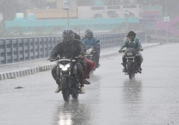 திருவள்ளூர் மாவட்டம் பழவேற்காட்டில் மழையில் நனைந்தபடியே, இருசக்கர வாகனத்தில் பயணிக்கும் வாகன ஓட்டிகள்.