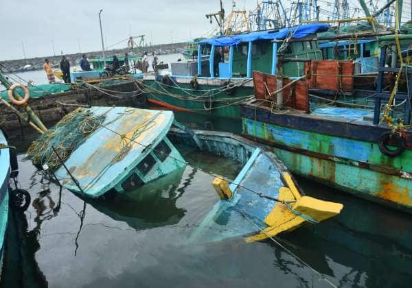 டிட்வா புயல் எதிரொலியாக, சென்னை காசிமேடு மீன்பிடி துறைமுகத்தில் படகு மூழ்கியது.