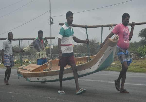சென்னை எண்ணூர் தாழங்குப்பம் பகுதியில் கடல் சீற்றம் காரணமாக, படகுகளை தோளில் சுமந்தவாறு பத்திரப்படுத்தும் பணியில் ஈடுபட்டுள்ள மீனவர்கள்.