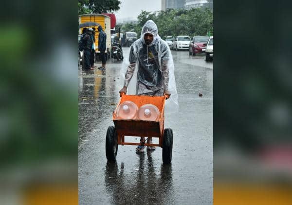 சென்னையில் பெய்துவரும் தொடர் மழையிலும் அன்றாடம் தனது உபயோகத்திற்கு தண்ணீர் எடுத்துச் செல்லும் தொழிலாளி.இடம்: எழும்பூர்