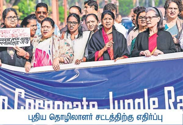 புதிய தொழிலாளர்கள் சட்டங்களுக்கு எதிர்ப்பு தெரிவித்து, பார்லிமென்ட் வளாகத்தில் நடந்த ஆர்ப்பாட்டத்தில் காங்கிரஸ் தலைவர் சோனியா, திமுக எம்பி கனிமொழி, காங்கிரஸ் எம்பி பிரியங்கா உள்ளிட்டோர் பங்கேற்றனர். இடம்: புதுடில்லி