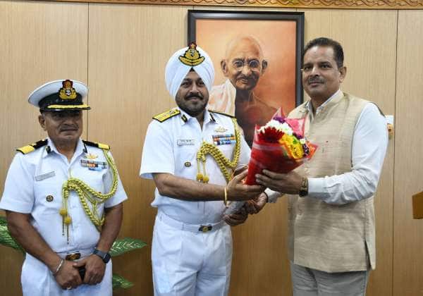 இந்திய கடலோர காவல்படை கிழக்கு பிராந்திய கமாண்டர் தந்த்விந்தர் சிங் சைனி மரியாதை நிமித்தமாக புதுச்சேரி தலைமைச் செயல சரத் சவுகானை சந்தித்து பேசினார்.அருகில் டி. ஐ. ஜி. எஸ்.எஸ.தசிலா