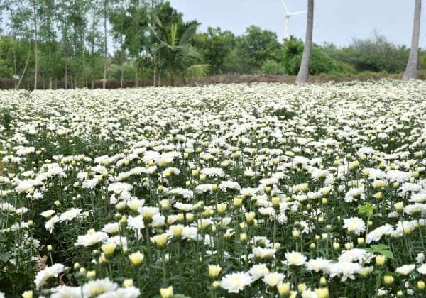 தூத்துக்குடி மாவட்டம் செட்டிகுறிச்சி பகுதியில் பயிரிடப்பட்டுள்ள செடிகளில் பணி போல் படர்ந்து பூத்துக்குலுங்கும் வெள்ளை சாமந்தி பூக்கள் ரம்மியமாக காட்சியளிக்கின்றது.
