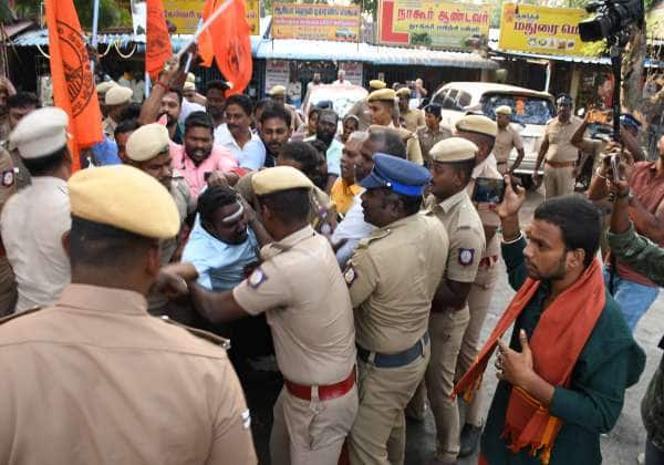 கடலூர் தலைமை தபால் நிலையம் அருகில் இந்து முன்னணி சார்பில் ஆர்ப்பாட்டம் செய்ய முயன்றவர்களை போலீசார் கைது செய்த போது தள்ளுமுள்ளு ஏற்பட்டது.