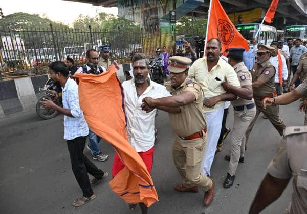 மதுரை திருப்பரங்குன்றத்தில், நீதிமன்ற உத்தரவை மீறிய திமுக அரசை கண்டித்து, இந்து முன்னணியினர் சாலை மறியலில் ஈடுபட்டனர். சாலை மறியலில் ஈடுபட்டவர்களை போலீசார் கைது செய்தனர்.இடம்: கோயம்பேடு, சென்னை