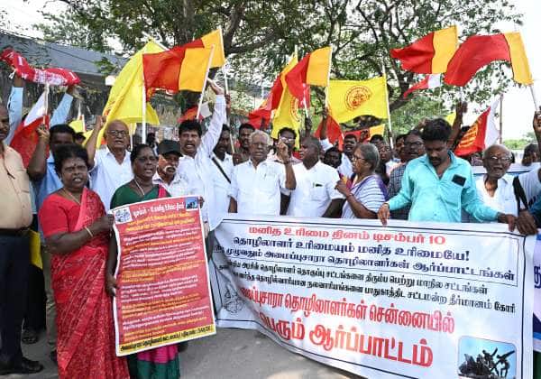 பழைய நிலையிலேயே பணி வழங்கக்கோரி, துாய்மை பணியாளர்களை ஆதரித்து உழைப்போர் உரிமை இயக்கம் உட்பட 11 தொழிற்சங்கங்கள் தலைமையில் 200க்கும் மேற்பட்ட பணியாளர்கள் ஆர்ப்பாட்டம் நடத்தினர்.இடம்: சென்னை