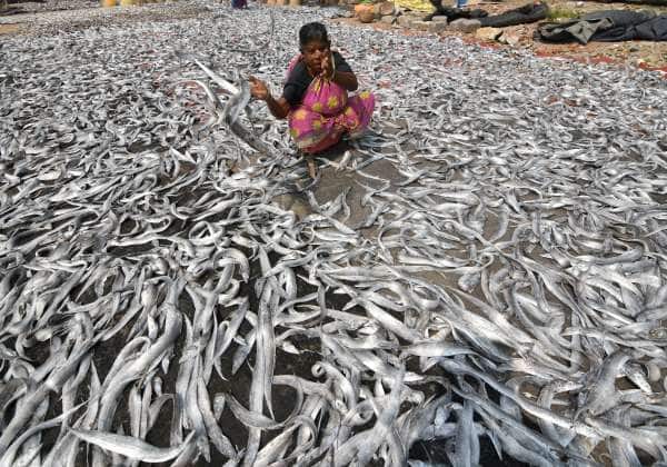சென்னையில் வெயிலின் தாக்கம் அதிகரித்து காணப்படுவதால் காசிமேடு மீன்பிடி துறைமுகத்தில் கருவாடு காய வைக்கும் பெண்.