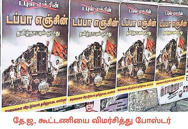 தேஜ கூட்டணியை விமர்சித்து தூத்துக்குடி, கோவில்பட்டி, ஓசூர், தேன்கனிக்கோட்டை உள்ளிட்ட தமிழகத்தின் பல்வேறு இடங்களில் போஸ்டர்கள் ஓட்டப்பட்டுள்ளன. இடம்: ஓசூர், கிருஷ்ணகிரி மாவட்டம்.