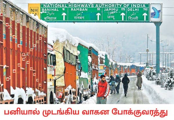 ஜம்மு காஷ்மீரின் அனந்த்நாக் மாவட்டத்தில் கடும் பனிப்பொழிவு காரணமாக, ஜம்மு - ஸ்ரீநகர் தேசிய நெடுஞ்சாலையில் நூற்றுக்கணக்கான லாரிகள் வரிசை கட்டி நிற்கின்றன. சாலையில் மலைபோல் பனி குவிந்து இருப்பதால் வாகனங்களை இயக்க முடியாமல் போக்குவரத்து முடங்கியுள்ளன.