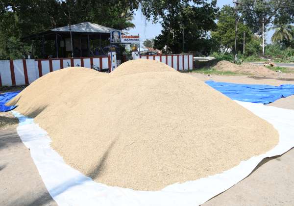வயல்களில் அறுவடை செய்யப்பட்ட நெல் மணிகளை விவசாயிகள் களத்தில் குவித்து வைத்துள்ளனர். இடம்: உடுமலை குமரலிங்கம் விநாயகர் கோவில் முன்பு.