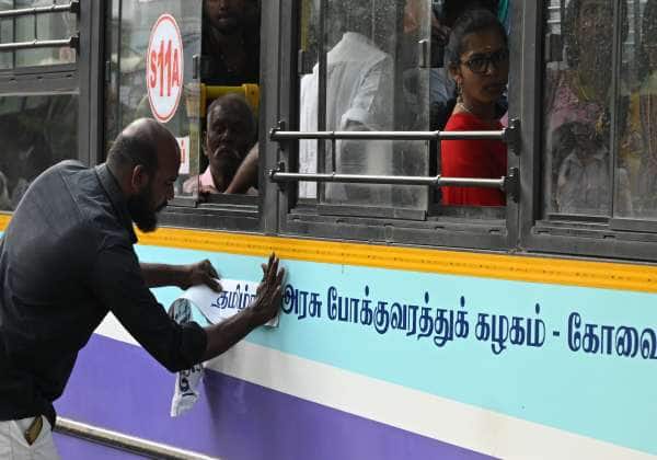 கோவை காந்திபுரம் டவுன் பஸ் ஸ்டாண்டில், அரசு பஸ்களில் தமிழ்நாடு ஸ்டிக்கர் ஒட்டிய நாம் தமிழர் கட்சியினர்.