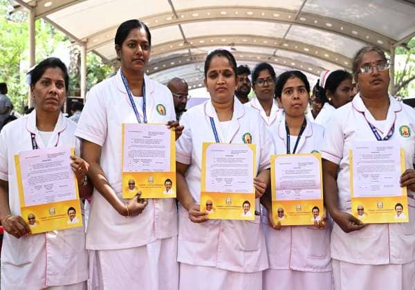 பணி நிரந்தரஆணையை பெற்ற மகிழ்ச்சியில் ஒப்பந்த செவிலியர்கள்.இடம்: டி.எம்.எஸ்.வளாகம், சென்னை.
