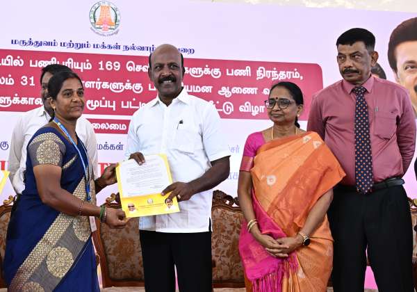 ஒப்பந்த செவிலியர்களில் 169 பேருக்கு பணி நிரந்தர ஆணையை மக்கள் நல்வாழ்வுத் துறை அமைச்சர் சுப்பிரமணியன் வழங்கினார்.