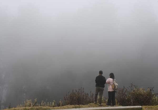 ஊட்டி தலைகுந்தர பகுதியில், பனிமூட்டத்தை ரசிக்கும் சுற்றுலா பயணிகள் .