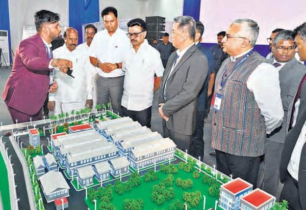 கள்ளக்குறிச்சி மாவட்டம் உளுந்தூர் பேட்டை சிப்காட் தொழில் பூங்காவில் தைவான் நாட்டின் பவுசென் குழுமத்தைச் சேர்ந்த, 'ஹை க்ளோரி புட்வேர் இந்தியா பிரைவேட் லிமிடெட்' நிறுவனம் அமைக்கும் காலணிகள் உற்பத்தி ஆலை வடிவமைப்பை முதல்வர் ஸ்டாலின் பார்வையிட்டார். உடன் அமைச்சர்கள், வேலு, ராஜா மற்றும் காலணி உற்பத்தி ஆலை நிர்வாகிகள்.