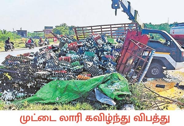 நாமக்கல்லில் இருந்து நாகர்கோவிலுக்கு முட்டை லோடு ஏற்றி சென்ற மினி லாரி, விருதுநகர் மாவட்டம் ஆர்.ஆர்.நகர் அருகே முன்பக்க டயர் வெடித்து விபத்துக்குள்ளானது. இதில் 60 ஆயிரம் முட்டைகள் உடைந்து வீணாகின.