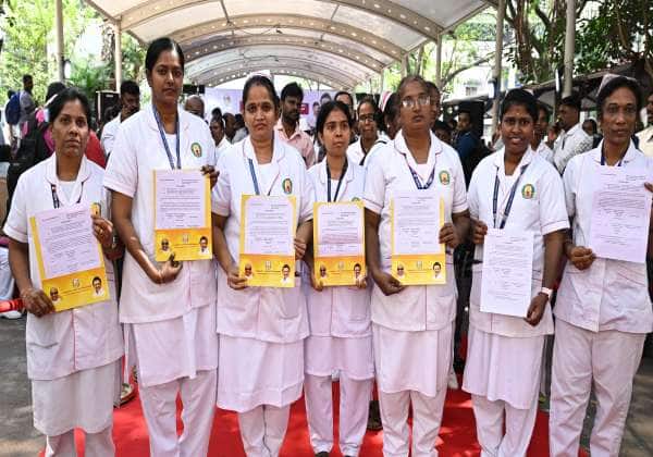 ணி நிரந்தரஆணையை பெற்ற மகிழ்ச்சியில் ஒப்பந்த செவிலியர்கள்.இடம்: டி.எம்.எஸ்.வளாகம், சென்னை.