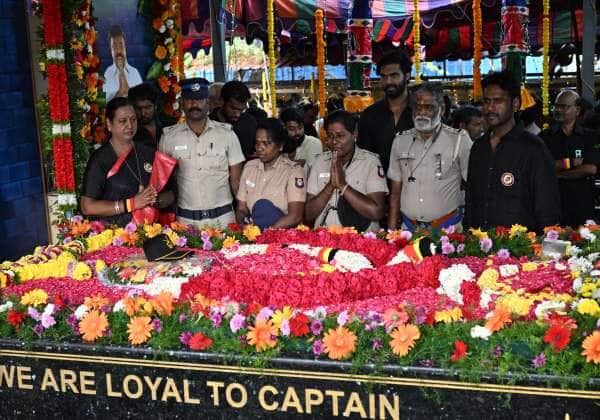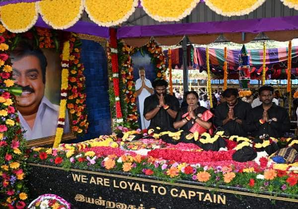 மறைந்த தே.மு.தி.க தலைவர் விஜயகாந்தின் இரண்டாவது நினைவு தினத்தை ஒட்டி, அவரது நினைவிடத்தில் அஞ்சலி செலுத்திய அவரது மனைவி பிரேமலதா மற்றும் மகன்கள். இடம்: கோயம்பேடு, சென்னை