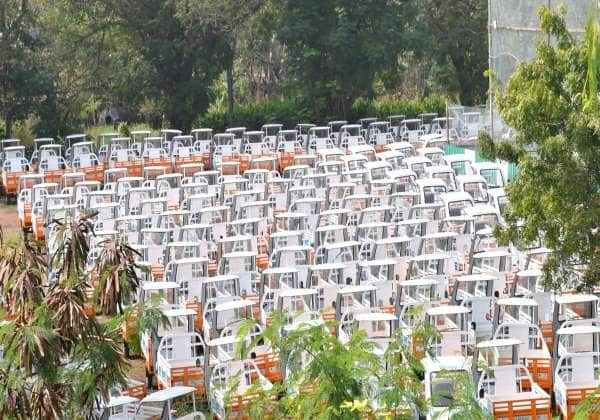 திருவொற்றியூர் மண்டலத்தில் துப்புரவு பணியாளர்களுக்கு வழங்குவதற்காக குப்பை சேகரிக்கும் பேட்டரி வாகனங்கள் நிறுத்தி வைக்கப்பட்டுள்ளன. இடம்: மாட்டு மந்தை மேம்பாலம் அருகே.
