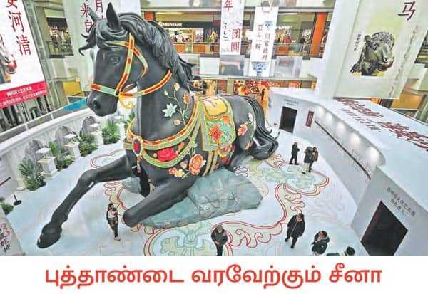 நம் அண்டை நாடான சீனாவின் பாரம்பரிய நாள்காட்டியின் படி, ஒவ்வொரு ஆண்டும் ஒரு விலங்கின் பெயரால் குறிக்கப்படுவது வழக்கம். இதன்படி, வரும் 2026 குதிரை ஆண்டாக கொண்டாடப்பட உள்ளது. இதைத்தொடர்ந்து அந்நாட்டு தலைநகர் பீஜிங்கில் உள்ள ஒரு வணிக வளாகத்தில் பிரமாண்டமான குதிரை சிலை காட்சிப்படுத்தப் பட்டிருந்ததை வாடிக்கையாளர்கள் ஆர்வத்துடன் பார்த்து ரசித்தனர்.