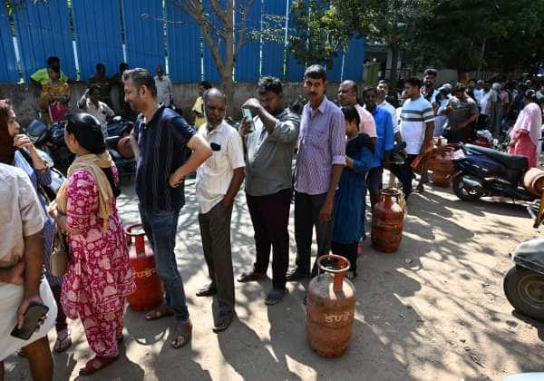 வீட்டு உபயோக சமையல் எரிவாயு சிலிண்டர் பற்றாக்குறையால் முன்பதிவு செய்தும் கிடைக்காத வாடிக்கையாளர்கள் கேஸ் ஏஜென்சி வெளியே நீண்ட வரிசையில் காத்திருந்தனர்.இடம் : திருவான்மியூர்