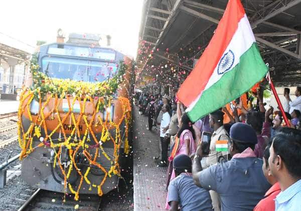 திண்டுக்கல் அம்ரித் பாரத் எக்ஸ்பிரஸ் ரயிலை மலர் தூவி வரவேற்றனர்.