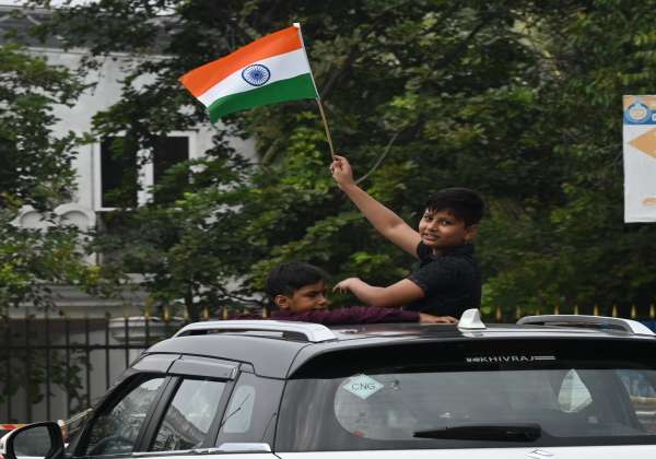 சென்னை மெரினா சர்வீஸ் சாலையில் சென்ற கார் ஒன்றில் கையில் தேசிய கொடி ஏந்தி சென்ற சிறுவன்.