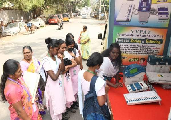 மின்னணு ஓட்டு இயந்திரம் உபயோகிக்கும் முறை குறித்து கோவை புலியகுளம் ரோட்டில் முதல் வாக்காளர்களுக்கு சாலையோரத்தில் விழிப்புணர்வு செய்யப்பட்டது.