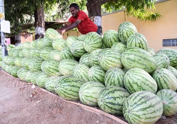 உடுமலை ரயில்வே ஸ்டேஷன் ரோட்டில் விற்பனைக்கு வைக்கப்பட்டுள்ள தர்பூசணி பழங்கள்.