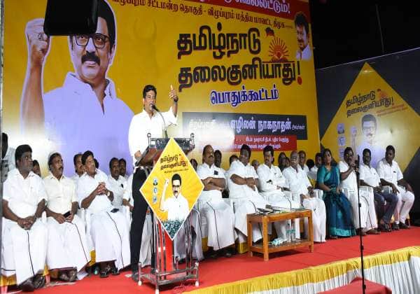 விழுப்புரம் புதிய பஸ் நிலையம் அருகே நகராட்சி திடலில் விழுப்புரம் சட்டமன்ற தொகுதி மத்திய மாவட்ட தி.மு.க சார்பில் பொதுக்குகூட்டத்தில் எம்.எல்.ஏ., எழிலன் பேசினார்.