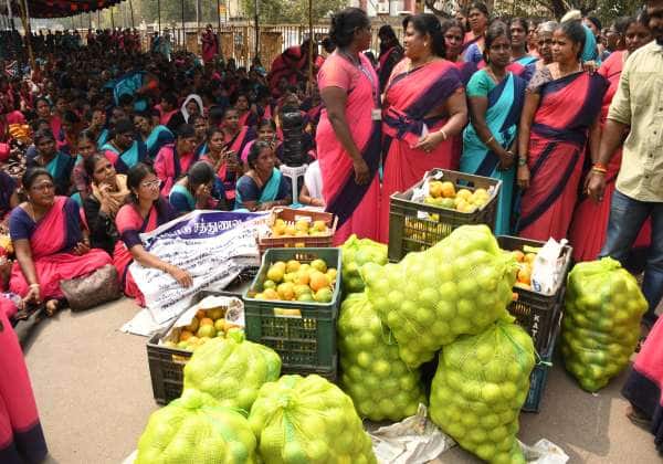 தமிழக அரசை கண்டித்து கோவை தெற்கு தாலுக்கா அலுவலகம் முன்பு போராட்டத்தில் ஈடுபட்டு வரும் அங்கன்வாடி ஊழியர்களுக்கு ஆரஞ்சு பழங்களை வழங்கிய அ.தி.மு.க.வினர் .